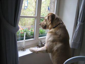 alleine sein und er darf auch eine Hundeschule besuchen, auch