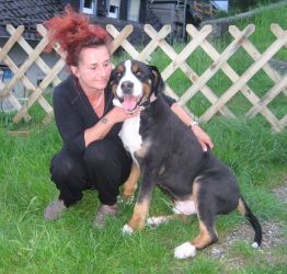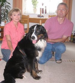 Benny der reinrassige Berner Sennenhund hat ein trauriges Schicksal. Er lebte viele Jahre zusammen mit dem Neufunderländer Bär und einer anderen Hündin bei seinen Besitzern. Dann starb sein Herrchen, die Hündin starb vor Trauer, sein Frauchen verlor das Haus, zog in eine kleine Mietwohnung, und die beiden Rüden mussten fortan 12 Stunden täglich alleine bleiben, weil ihr Frauchen wieder voll arbeiten gehen musste. Ihr Frauchen gab sie schweren Herzens ins Tierheim, um ihnen wieder eine artgerechte Haltung zu ermöglichen. Benny hat sehr schnell ein tolles neues Zuhause gefunden. Er ist zu der Mutter einer unserer Mitarbeiterinnen gezogen. Nun hat er wieder eine sehr liebe Familie, ein Haus mit Garten, ein Frauchen, das immer zuhause ist und außerdem 7 Katzen und viele Kaninchen als Kameraden. Benny kann sich jetzt in Ruhe einleben, wobei er sich schon sichtlich wohlfühlt und sein neues Heim auch schon bewacht. Und nachdem die dicke verfilzte Wolle abgeschoren ist, ist er wieder ein fröhlicher beweglicher Hund geworden.